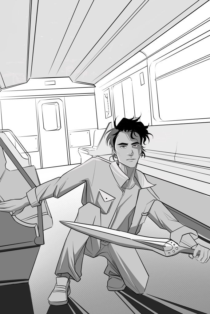 The motion of time snapped back to its normal pace. The train car softly rumbled beneath me. In my hand, I felt the weight and cold metal of a Bronze Age sword. It would be too weak to withstand a blow from the strange man’s blade, but more than strong enough to rend flesh, which my senses told me he was made out of.
